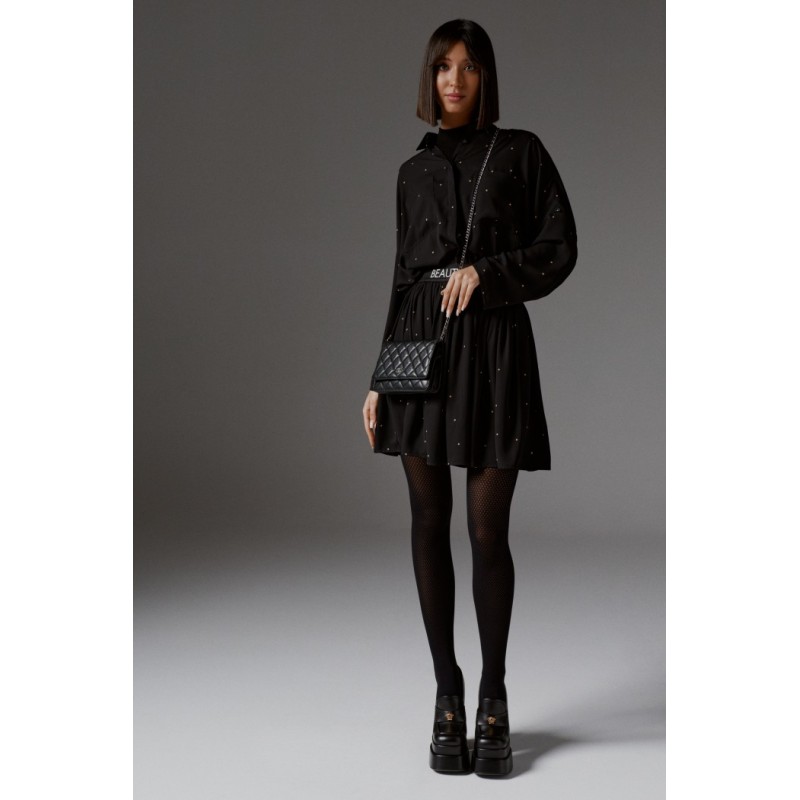 Блуза женская прямого свободного кроя с рукавом со спущенным плечом, выполнена из струящейся легкой ткани. Воротник рубашечного типа. Застежка центральная на петли пуговицы. По переду нашиты два крупных кармана. Спинка отрезная. В боковых швах разрезы. Длина изделия 73 , длина рукава 72 от края горловины.