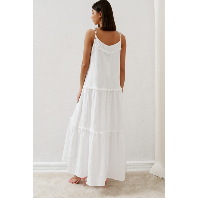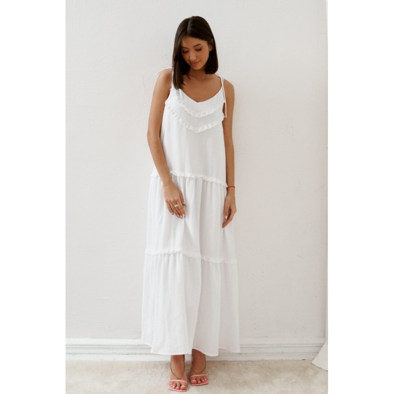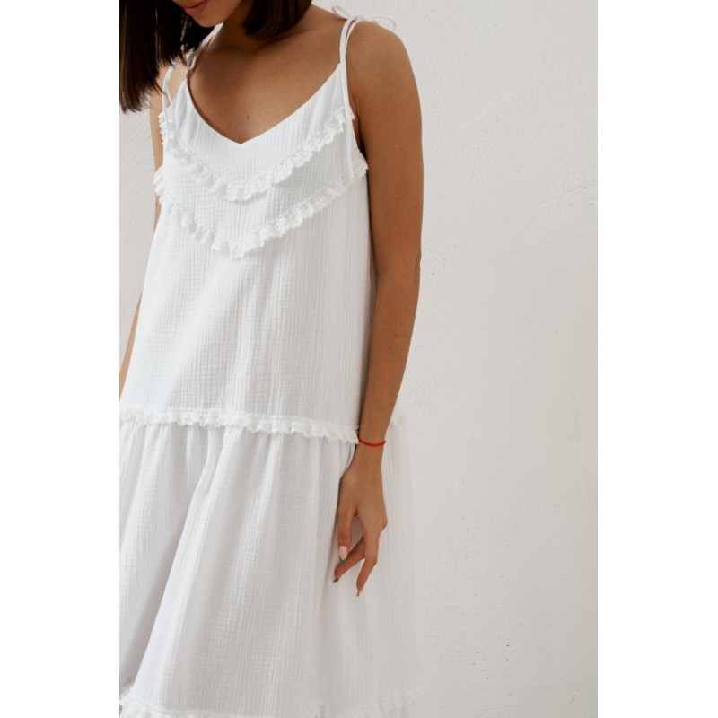 Сарафан выполнен из нежнейшего муслина белого цвета с деталями из кружева. Ваш нежный утонченный образ.