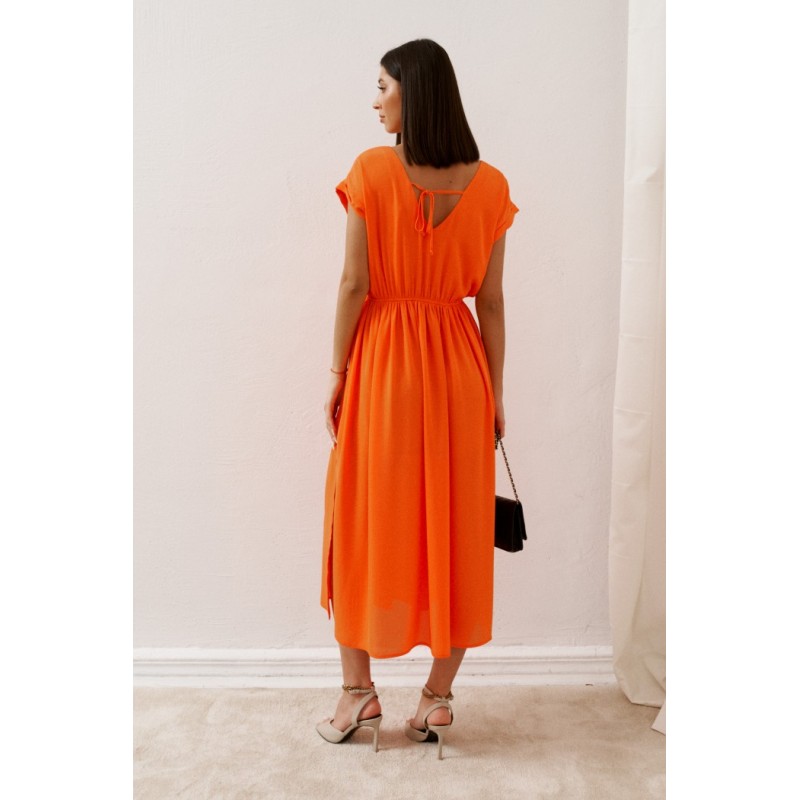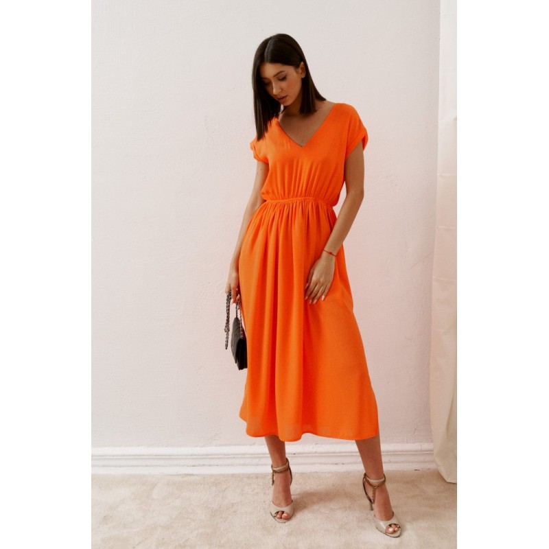 Легкое платье полуприлегающего силуэта выполнено из полотна цвета мандарин. Лето для ярких красок, платье идеально подойдет для встреч на летних террасах, прогулок, свиданий.