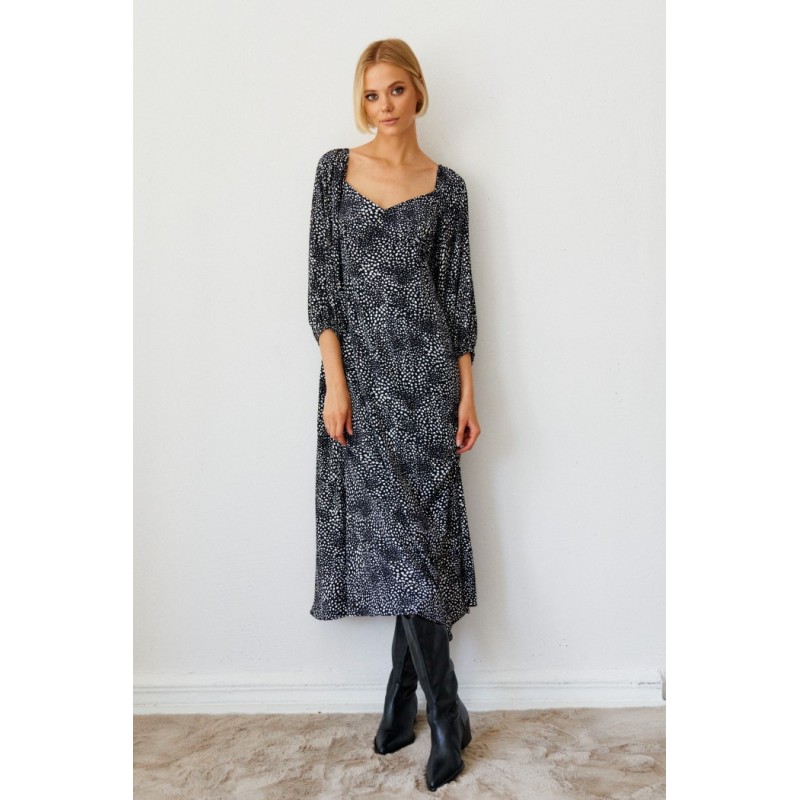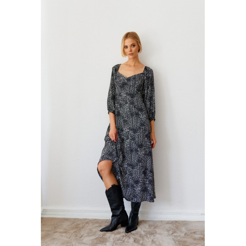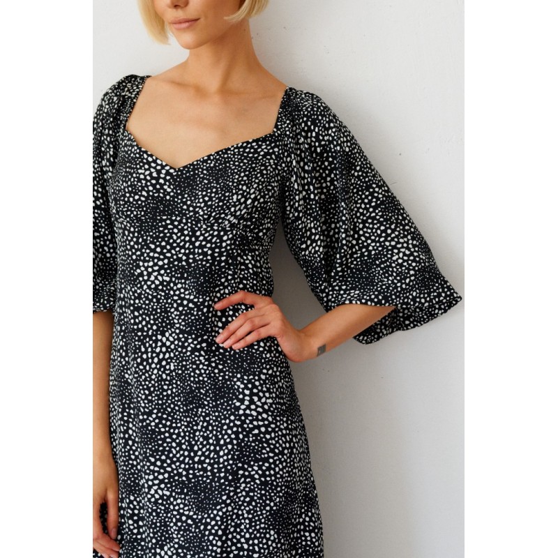 Платье полуприлегающего силуэта выполнено из полотна с абстрактным принтом. Фасон изделия и контрастный принт сделает Ваш образ нежным и женственным.