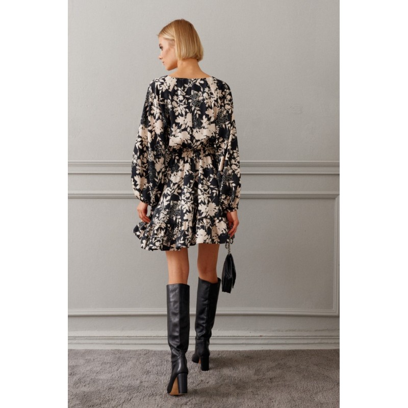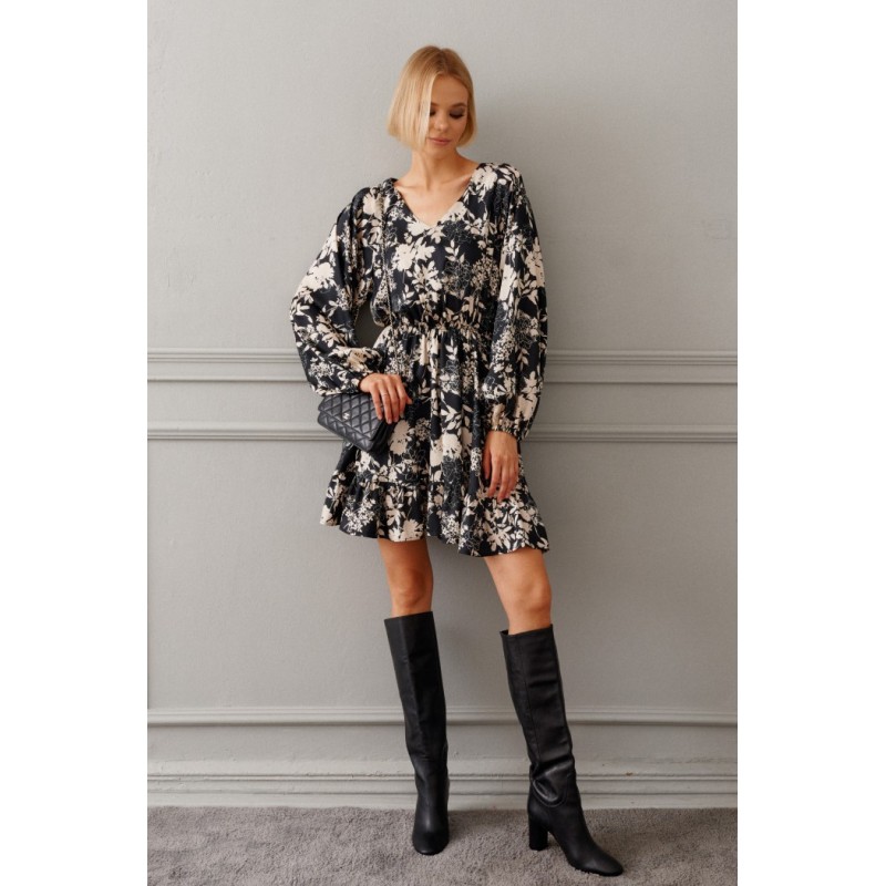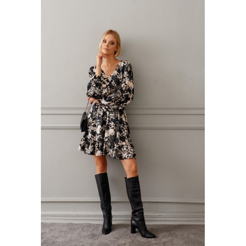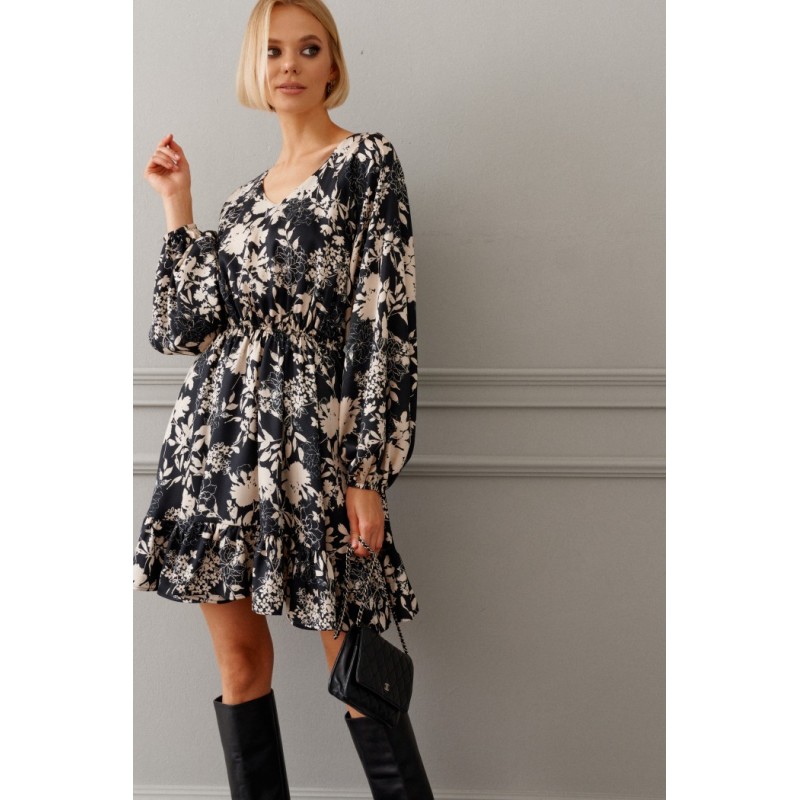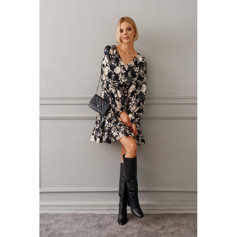Платье полуприлегающего силуэта выполнено из полотна с цветочным контрастным принтом. Замечательный вариант на мероприятие, который прекрасно подойдет и для каждодневного образа.