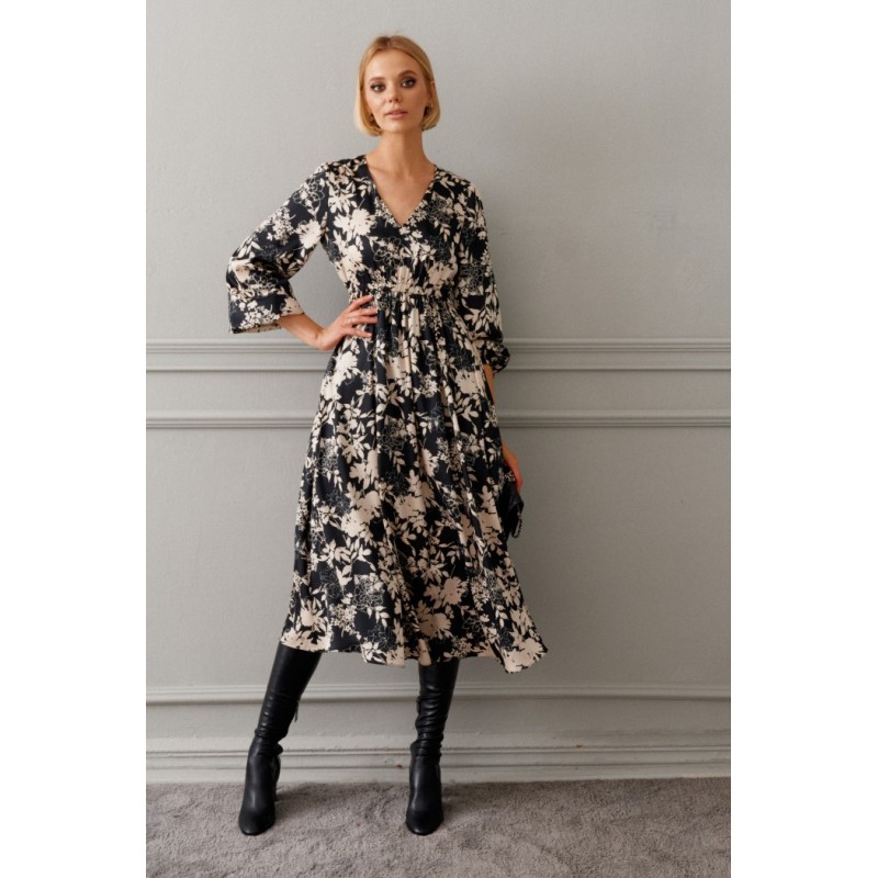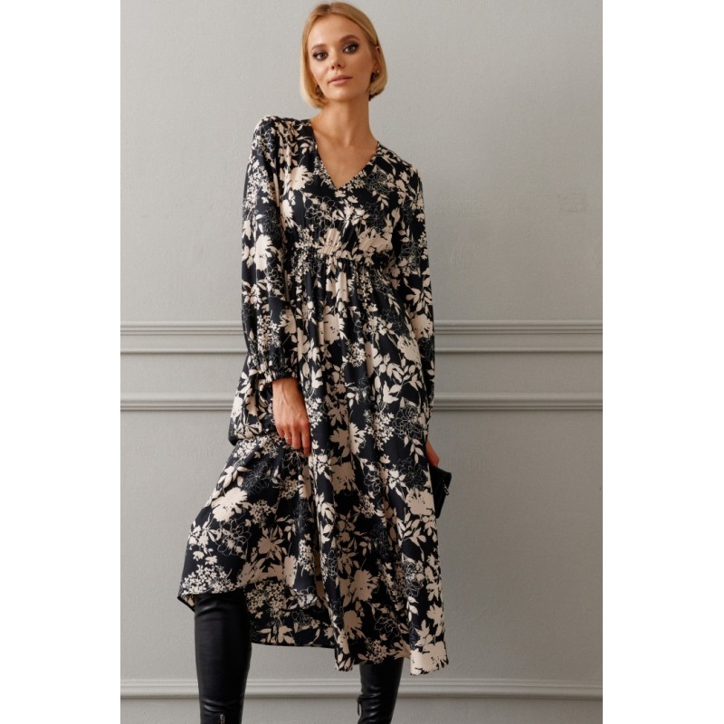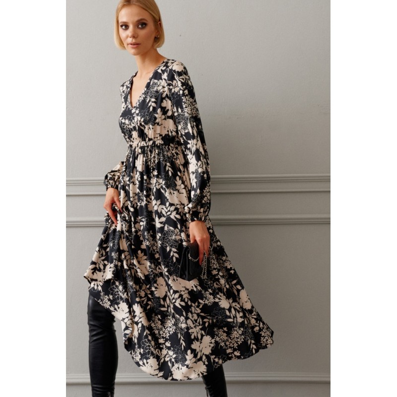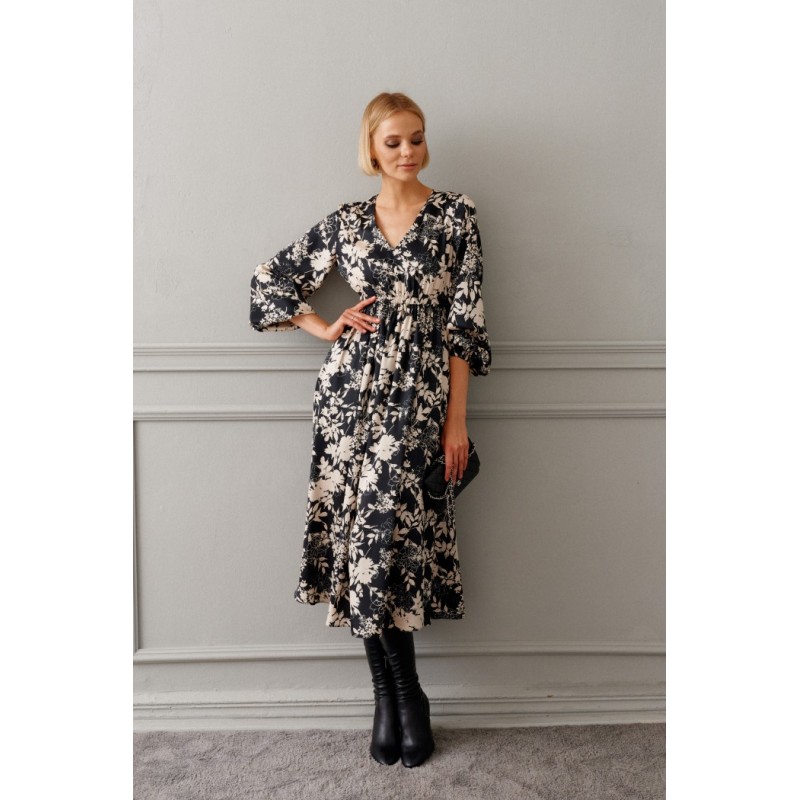 Платье полуприлегающего силуэта выполнено из полотна с цветочным контрастным принтом длины миди. Замечательный вариант на мероприятие, который прекрасно подойдет и для каждодневного образа.