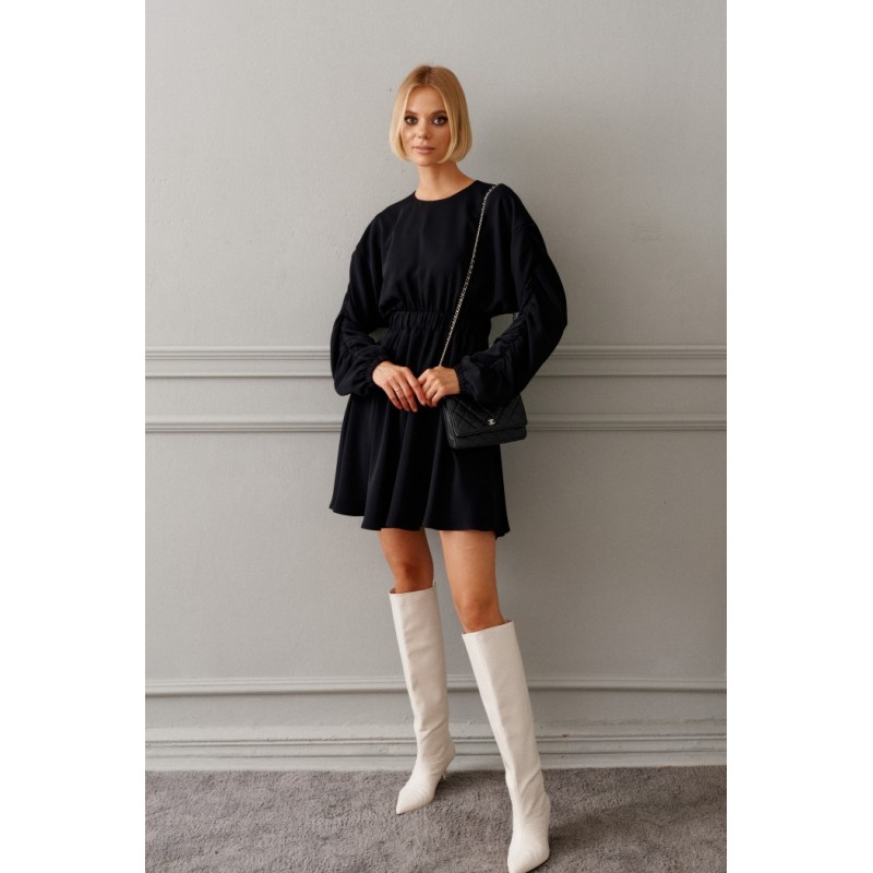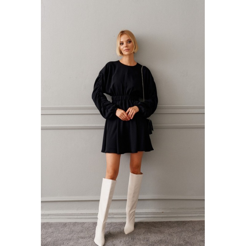 Характеристики: прилегающий силуэт, отрезное, отрез на резинке, горловина овальная, рукав спущен, по рукаву декоративная драпировка, застежка петля пуговичка по спинке, низ в изделии свободного кроя. Длина 87 см, длина рукава 73 см.