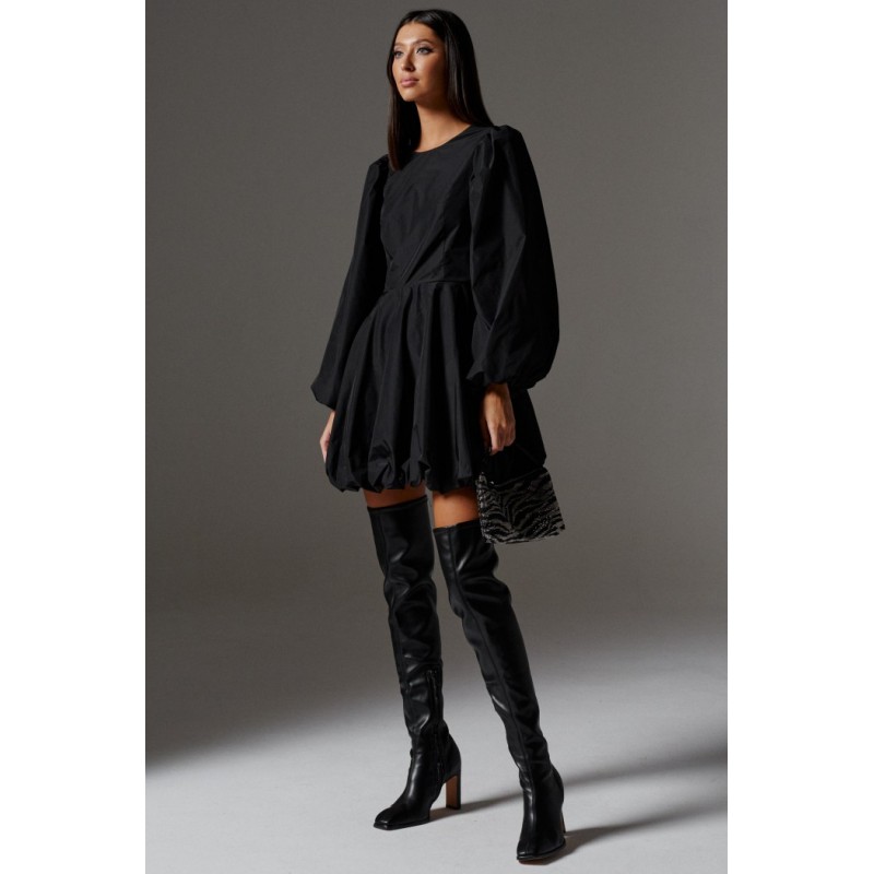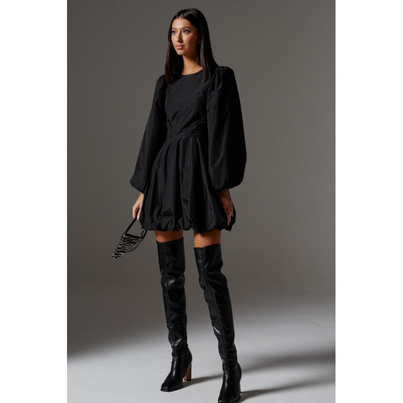 Роскошное короткое платье с акцентами пышными рукавами выполнено из полотна черного цвета. Идеальное черное платье на торжественное мероприятие.