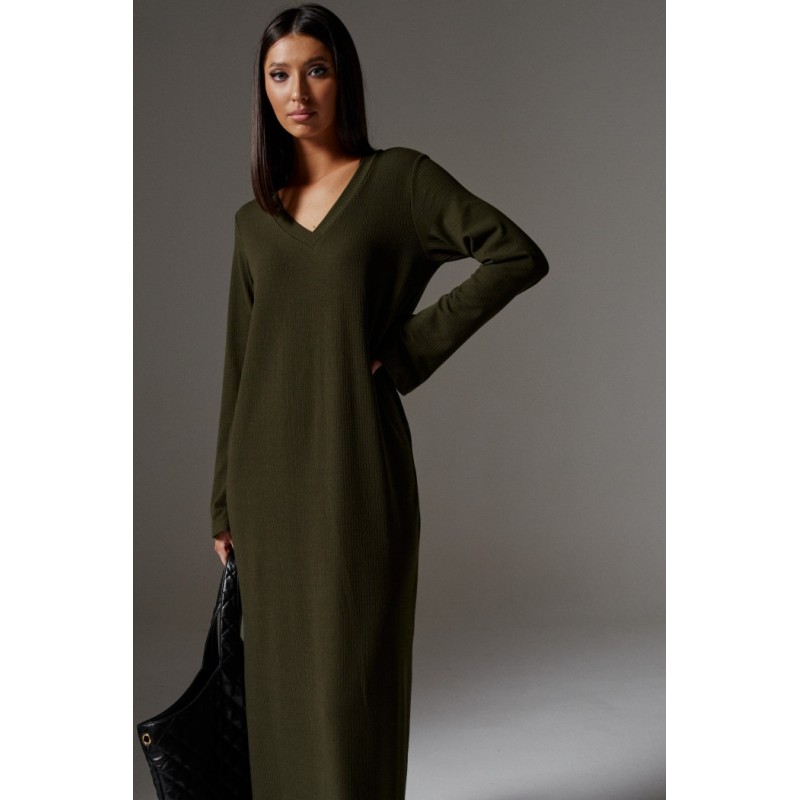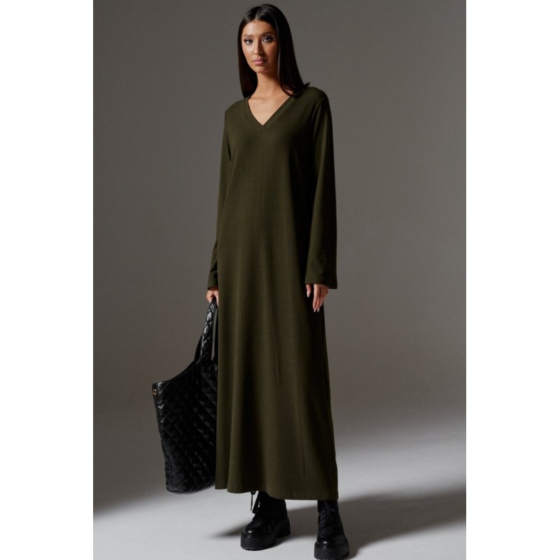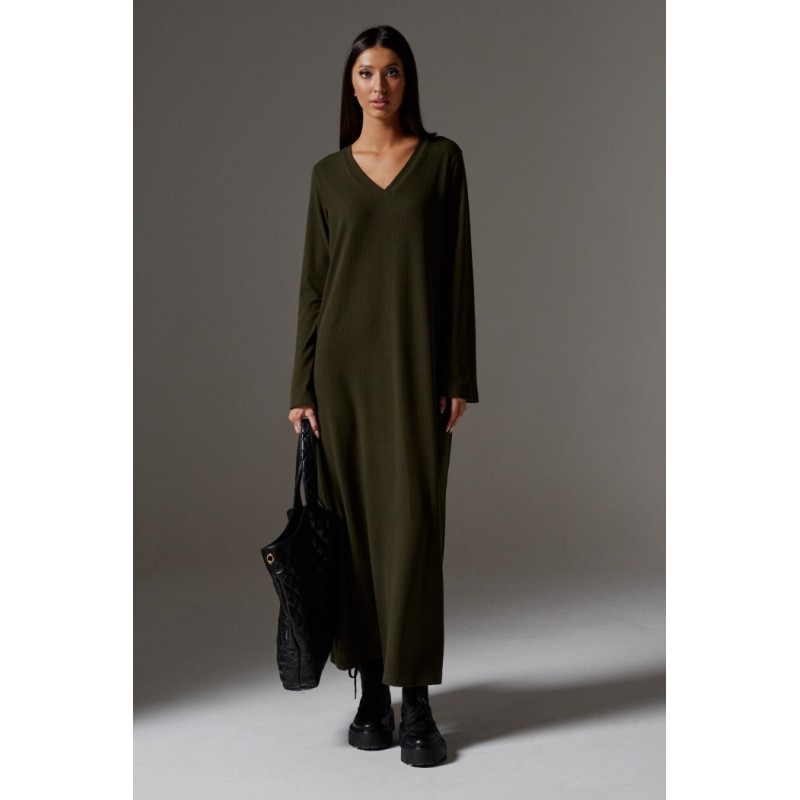 Платье А образного силуэта выполнено из трикотажного полотна в рубчик цвета хаки. Уютное, женственное, универсальное платье. Характеристики: А образный силуэт, V образный вырез горловины, рукав втачной. Длина изделия 137 см, длина рукава 64 см.